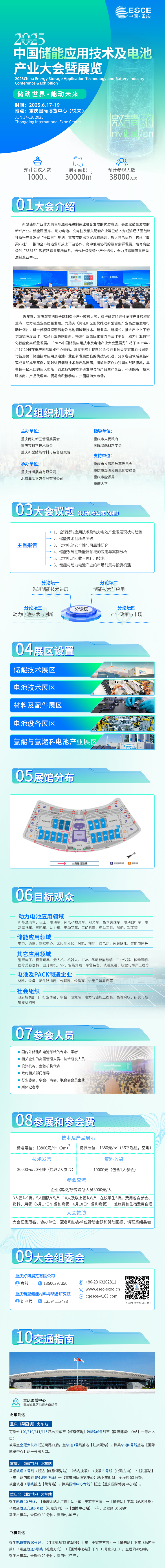2025中国储能应用技术及电池产业大会暨展览 主题:储动世界、能动未来 时间:2025年6月17—19日 地点:重庆国际博览中心(悦来) 大会规模:会议人数:1000人、展览面积:预计3万平方米、买家人数:预计3.8万人次 主办单位:重庆两江新区管理委员会、重庆市科学技术协会、重庆新型储能材料与装备研究院 承办单位:重庆好博展览有限公司、北京海蓝立方会展有限公司 前言: 为搭建储能及电池产业生态链供采对接务实合作平台,助力行业数字化智能化高质量发展。由重庆两江新区管理委员会、重庆市科学技术协会、重庆新型储能材料与装备研究院联合主办的“2025中国储能应用技术及电池产业大会暨展览”拟于2025年6月17-19日在重庆国际博览中心举行。 重庆位于西南地区核心,连接“一带一路”和长江经济带,既是物流枢纽,又是制造业中心。这为储能企业提供了辐射全国甚至全球的地理便利。同时,重庆拥有成熟的电子信息、新能源汽车、智能制造产业链,为储能企业提供了广泛的上下游合作机会。智能网联新能源汽车、新一代电子信息制造业、先进材料三大万亿级产业集群,更是为储能产业的发展奠定了坚实的工业基础。更重要的是,重庆的储能项目不仅能满足本地需求,还可以为成渝地区“双城经济圈”提供能源保障。随着人口与产业进一步聚集,能源需求的增长将持续推动储能市场的扩张。因此,重庆在储能产业上的布局不仅是为了自身的发展,更是为了整个成渝地区的能源安全和经济繁荣。。 作为在“买方”市场举办的行业会展活动,旨在充分发挥“买方”市场强大平台作用,纵向深度呈现储能产业从设计、材料、智造到技术应用的完整生态链。横向推动产业链、价值链、创新链各方务实合作,达成贸易对接。以“交流、展示、发布、采购”4大功能为核心,打造面向储能产业的新材料、新技术、新产品、新装备、新供应链及前瞻科技产品一站式生态平台。 大会荣誉主席潘复生院士将携百余位行业专家共同探讨新形势下储能技术应用及电池产业创新发展面临的挑战与机遇,分享各自领域最新研究成果和成功案例,同时展示全生态链企业最新的技术产品与解决方案、为企业创造更多商业机会,拓展市场渠道,助推绿色低碳经济快速发展。预计来自政界、产业界、学术界的200+领导嘉宾,1000+注册参会代表,500+全球展商,38000+专业观众将齐聚重庆,共话全球储能及电池产业未来发展之路。 咨询电话:1350039735