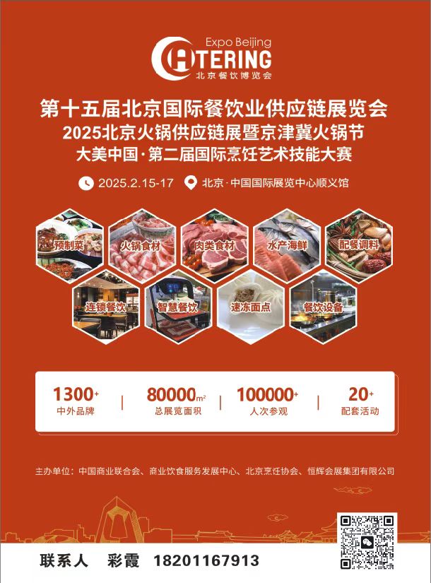 参 展 邀 请 函 收件人:市场部/展会负责人 发件人:彩霞 18201167913 第十五届北京国际餐饮业供应链展览会 第五届中国预制菜产业大会暨展览会 北京国际火锅食材及用品展览会 2025年2月15-17日 北京 中国国际展览中心(顺义馆) 1300+中外品牌参展 80000+展览面积 100000+专业观众 20+论坛及赛事活动 主办单位: 中国商业联合会 商业饮食服务业发展中心 北京烹饪协会 北京市中华厨艺研究会 具体主承办: 北京恒辉国际展览有限公司 展会概况 为深入贯彻“十四五”规划纲要精神,推动经济高质量发展,更好满足人民对美好生活需要,加快构建国内经济大循环、国内国际双循环发展新格局,进一步释放餐饮消费潜力,推动餐饮业持续繁荣发展,由中国商业联合会、商业饮食服务业发展中心、北京烹饪协会、首旅集团集采中心联合主办,北京恒辉国际展览有限公司具体主承办的第十五届北京国际餐饮业供应链展览会、第四届北京预制菜展览会将于2025年2月15日至17日在中国国际展览中心顺义馆举办。北京餐博会经过多年的累积与发展,已经成为北方地区规模大、影响力强的餐饮行业展览交易盛会。 北京餐博会回顾 第十四届北京国际餐饮业供应链展览会于2024年3月15日至17日在中国国际展览中心成功举办。商务部原副部长张志刚出席并宣布开幕。中国商业联合会党委书记、会长姜明,北京市商务局副局长郭文杰,首旅集团副总经理高飞,中国饭店协会副会长张景富,中国烹饪协会副会长、北京烹饪协会会长云程出席并致辞。 本届餐博会共有1,300家中外品牌参展,总面积达80000平方米,知名品牌有:首农食品集团、首旅集团、农夫山泉、马大姐食品集团、平太荣渔业、盖世食品、吉得利食品、祥斌鲍鱼、琴雨食品、中红三融、东湖老陈醋、早康枸杞、宁夏百草滩羊、恒鑫、烁宇豪、沙伯特、龙骏环保等,以及河北省展团、山西省展团、哈尔滨展团、马来西亚展团,为期三天的博览会到场观众达120000人次。 展会亮点 活动激活热度:博览会同期还举办了“北京市第四届小吃美食文化节”、“大美中国·第三届烹饪艺术技能大赛”、“北京市连锁经营协会产销对接会”等配套活动,全方位、多层次地满足供应商与买家之间日益增高的市场需求、转型需求,一起探讨餐饮行业现状与未来发展趋势、创新发展机会,为供应商、采购商及业内人士呈现一场高品质的